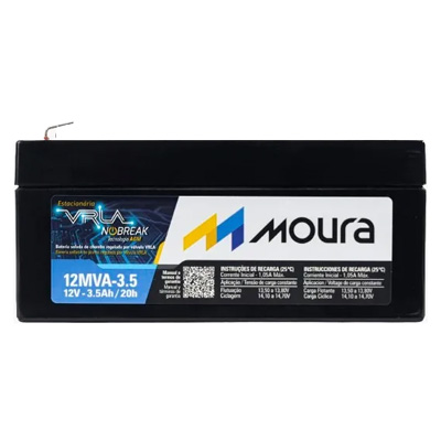 - Bateria estacionária VRLA Moura 12MVA-3.5, de 12 V com capacidade nominal de 3.5 Ah e conector F2.