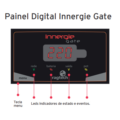 - Nobreak Ragtech modelo Innergie Gate 1/2 HP CB com potência de 700 VA (373 W), desenvolvido especialmente para automatizadores de portões dos tipos deslizantes, pivolantes e basculantes.