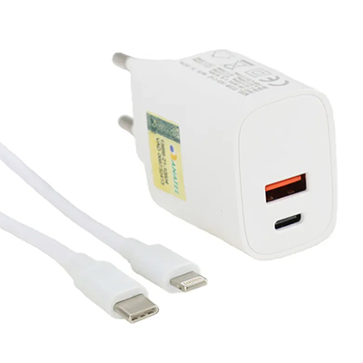 - Carregador de parede para smartphone até 20 W Com 2 portas USB-C e USB 3.1 A com cabo USB C para Lightning de 1,5 metros.