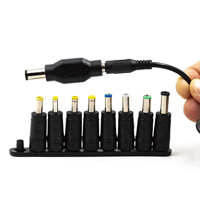 - Acompanha 12 conectores com diferentes formas para encaixe para a maioria das marcas internacionais. Todos os conectores são automáticos e, ao conectar a fonte universal, a tensão será indicada no visor LCD.