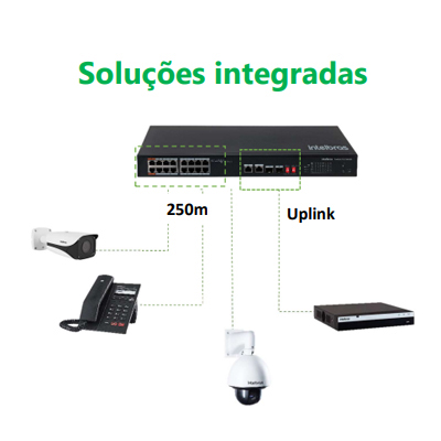 - Possui 16 portas Fast Ethernet com suporte à função PoE, sendo 2 portas com função Hi-PoE, 2 portas Gigabit Ethernet para uplink de dados e 2 portas SFP, flexibilizando a rede e economizando em seu projeto.