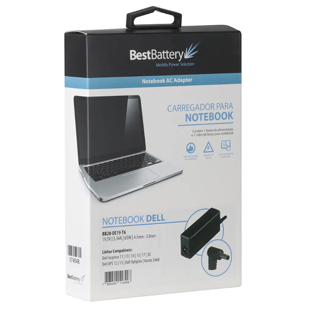 ..- Fonte de alimentação para notebooks Dell fabricada pela Best Battery BB20-DE19-T6, com potencia máxima de 65 W, permitindo carregar o notebook em tomadas.