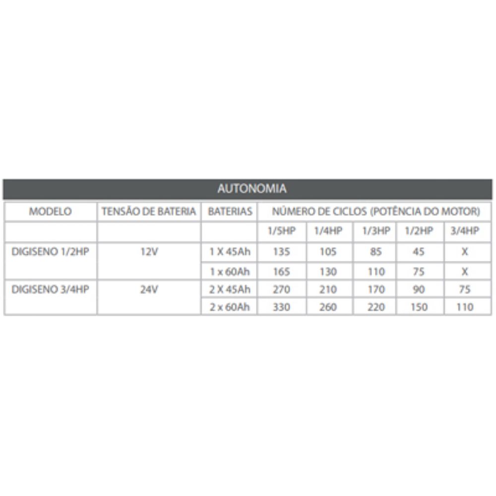 - Motor 3/4 HP utilizando 1 baterias 60 Ah: 75 ciclos