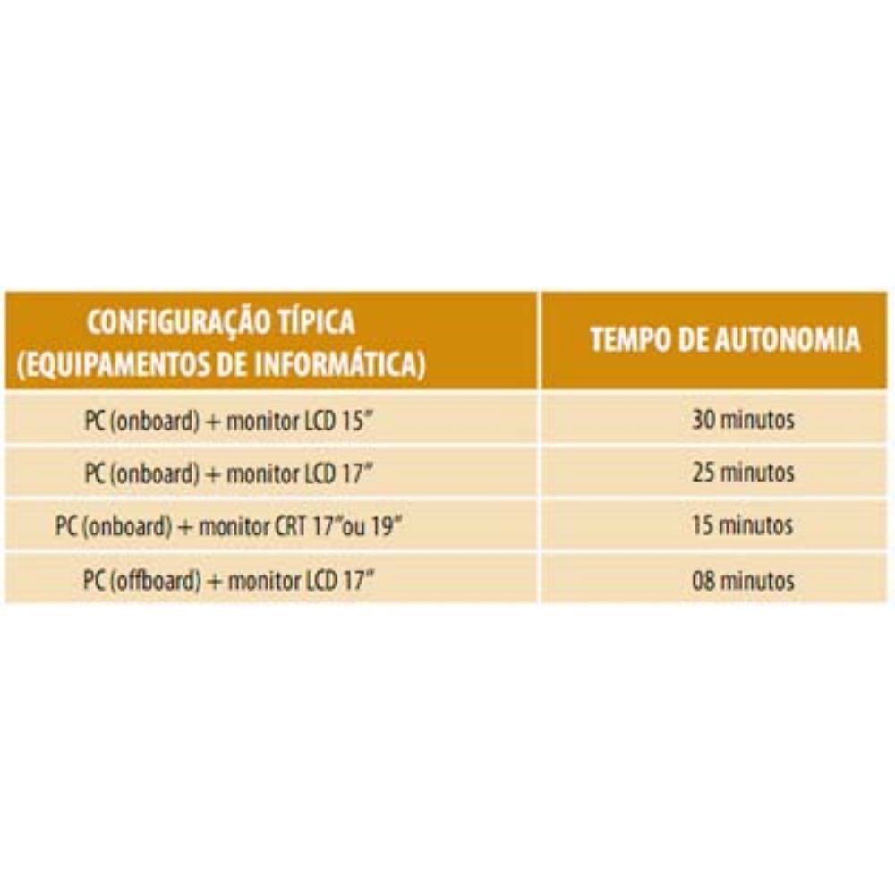 - Alarme audiovisual para queda de rede, subtensão, fim do tempo de autonomia, final de vida útil da bateria, sobretensão, sobrepotência, sobretemperatura, e falha no ventilador.