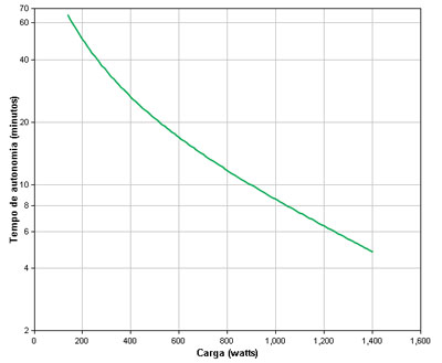 - Autonomia de 16 minutos em meia carga (uso de 700 W) e 6 minutos em plena carga (uso de 1400 W).