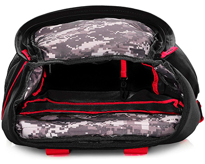 - Bolso gigante com grande abertura e zíper, com revestimento de camuflagem digitalizada única e divisórias para acessórios.