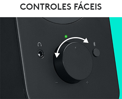 - Painel frontal com botão de emparelhamento por Bluetooth, de energia, de volume e a entrada para fone de ouvido localizados no alto-falante direito.
