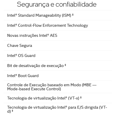 - Instruções para Normas Avançadas de Criptografia (AES-NI): Adicionam aceleração do hardware aos algoritmos de AES e aumentam a velocidade da execução dos aplicativos de AES.