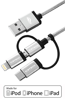 Cabo USB 3 em 1 Lightning microUSB USB-C C3tech CB-3000