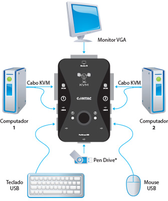 ..- Switch KVM USB, Comtac 9250, que permite administrar até 2 PCs com apenas um conjunto de teclado, mouse e monitor.