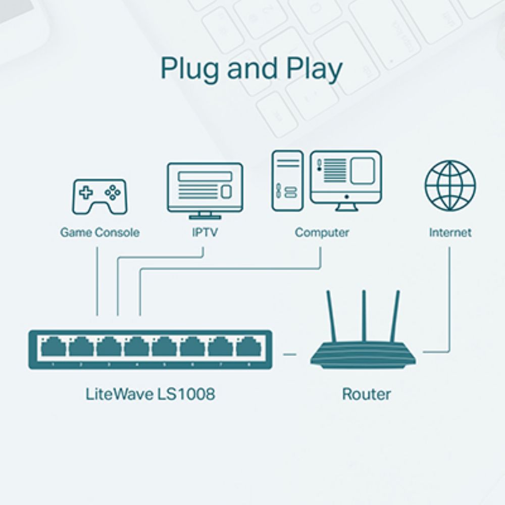 ..- Switch de mesa TP-Link LS1008 (Versão 1.0), com 8 portas 10/100 Mbps, ideal escritórios de pequeno a médio porte.