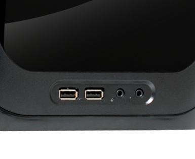 - Painel frontal com 2 portas USB e 2 mini-jack 3,5 mm para conexões de áudio.