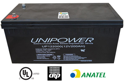..- Bateria de chumbo-acido Unipower UP122000, com tensão de 12 V e corrente de 200 Ah.