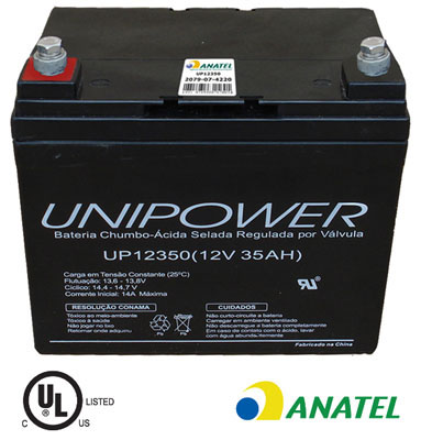 ..- Bateria de chumbo-acido Unipower UP12350, com tensão de 12 V e corrente de 35 Ah.