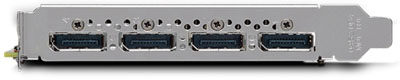 - Possui 4 conectores DisplayPort 1.4 (com resolução 5120 x 2880 em 60 Hz) e DVI-DL (através de cabo adaptador incluso).